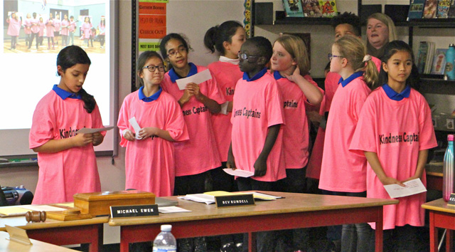 The “Kindness Captains” at Richard McBride elementary speak in front of parents, teachers and trustees. They are part of a school culture that recognizes how everyone treats each other has a powerful effect on classroom performance and school climate.