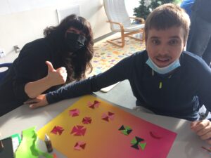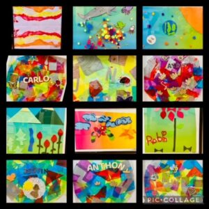 During three visual art workshops students explored various themes and used various mediums to express themselves. The lessons were created with the goal of teaching the visual art elements combined with the big ideas presented in the BC numeracy and literacy curriculum. The abstract string painting technique was introduced after teaching the concepts of symmetry and asymmetry. Students reflected on the use of digital symmetry after watching the OK Go Pilobolus Dance All Is Not Lost video and learning about symmetry and asymmetry in nature. The felt on paper art workshop was inspired by Metis Felt Artwork. As inspiration, students were shown photos of the collaborative felt artwork created by Indigenous artists for the Brodie Street Library in Thunder Bay, Ontario. Aspects of nature were explored while experimenting with shape, space, and texture. The collage mixed media art continued to explore the relationship between humans and the natural world.