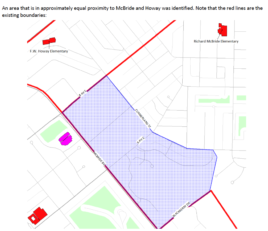 The shaded area above in blue is the proposed boundary change which would become part of the F.W. Howay catchment. This area is approximately equal proximity to Richard McBride and F.W. Howay.