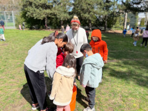 On a sunny but cool spring day, two classrooms of students gathered in the courtyard at Connaught Heights Elementary: Mrs. Wong’s excited kindies stood alongside Ms. Amy’s grade 5 “big buddies.” Once partnered up, the pairs made their way to the grass field and playground, each with a pair of tongs between them to go engage in a little clean up. They found everything from a soggy lost mitten that had fallen behind a bush to snack wrappers that had failed to make it to the bin. Each was carefully collected in a bucket and examined.