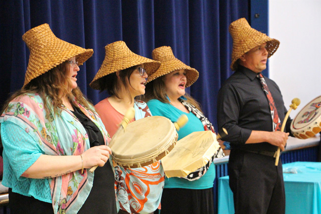 The Aboriginal Education staff at New Westminster Schools develops programs and supports for Aboriginal students. Here, they are celebrating district kindergarten, grade 8 and graduating high school students during the annual Qayqayt Honouring and Rite of Passage ceremony…