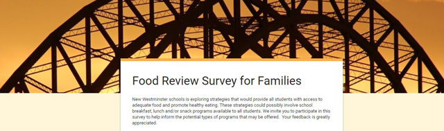 Families in New Westminster Schools are invited to participate in the Food Review Survey: click here.
