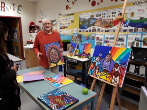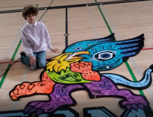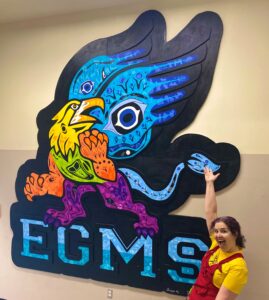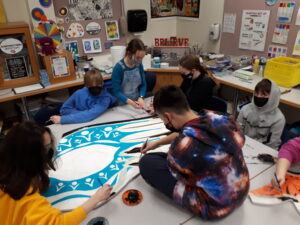 When Angela decided to create the mural, she knew to start with Derek’s design. But to get more guidance and keep Indigenous insight throughout, she invited Jerry White – a Vancouver-based Cree painter – to help turn the design into a mural. Jerry spent a whole day at EGMS, working with students and Mrs. Jurgensen. He made recommendations on colours, design blocking and helped advise on the process of engaging students in the creation.