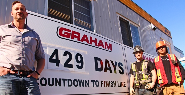 From left to right:  For Superintendent Robert Skierka, Carpenter Johnny Beaupré, and Safety Coordinator Trevor Roberts, it’s a massive team effort in getting BC’s largest high school up and out of the ground – on time and on budget.