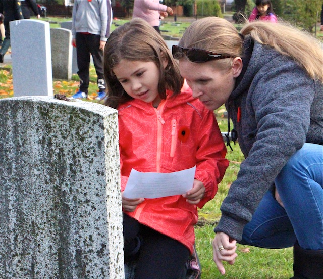 “The simple act of placing a poppy on a headstone has a profound impact,” honorary Col. Karen Baker-MacGrotty of the Royal Westminster regiment told the elementary students. She then invited each to find a headstone and take a moment to think of the sacrifice of the soldier whose name they read on the headstone.