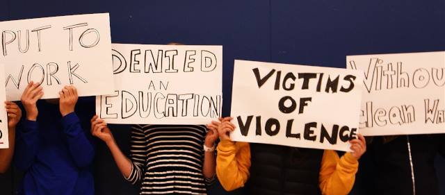 One by one they held up signs for those children in the world who are enslaved, in poverty, in war zones, without clean water, denied an education – or without voice.