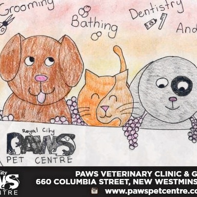 Check out the image of a bowlful of dogs and cats for Paws Veterinary Clinic and Grooming by grade 7 student Sahara, at Fraser River Middle School.