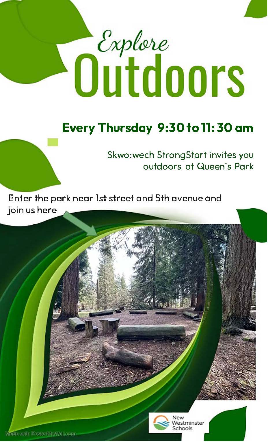 Every Thursday from 9:30 to 11:30 am, join our Skwo:wech StrongStart educator at Queens Park for a special outdoor version of learning through play! Enter the park near 1st Street and 5th Ave, to join us at the learning circle.