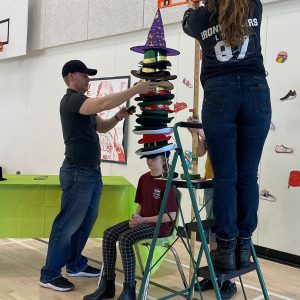 After a quick introduction from Vice Principal, Darren Elves, the mic was passed on to Brett to disclose the rules, and outline what their goal height was. The record (at the time of this attempt) was 107 cm. In order to beat it, the hat-stack would have to beat that height, and then stay standing without support for 30 full seconds.