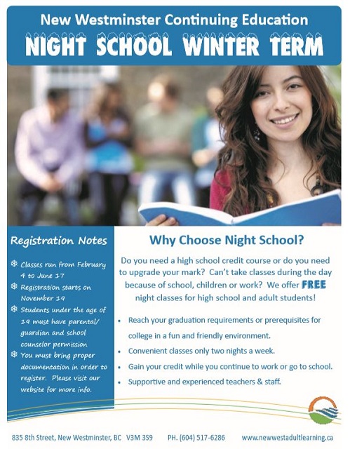 All classes are held at New Westminster Secondary School and run twice a week from February 4 to June 17.
