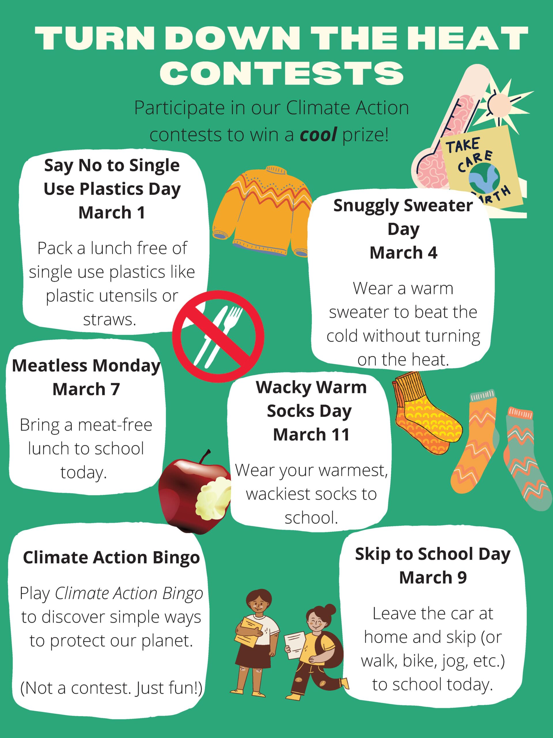For the two weeks leading into Spring Break, we’ve dropped the daytime temperature by a few degrees in our schools and other sites: setting an example by taking action and opening up opportunities to learn! This initiative, organized by our District’s Climate Action Committee, is providing staff the opportunity to have timely conversations about a wide range of actions that we can each take to fight the climate crisis we’re seeing around us.