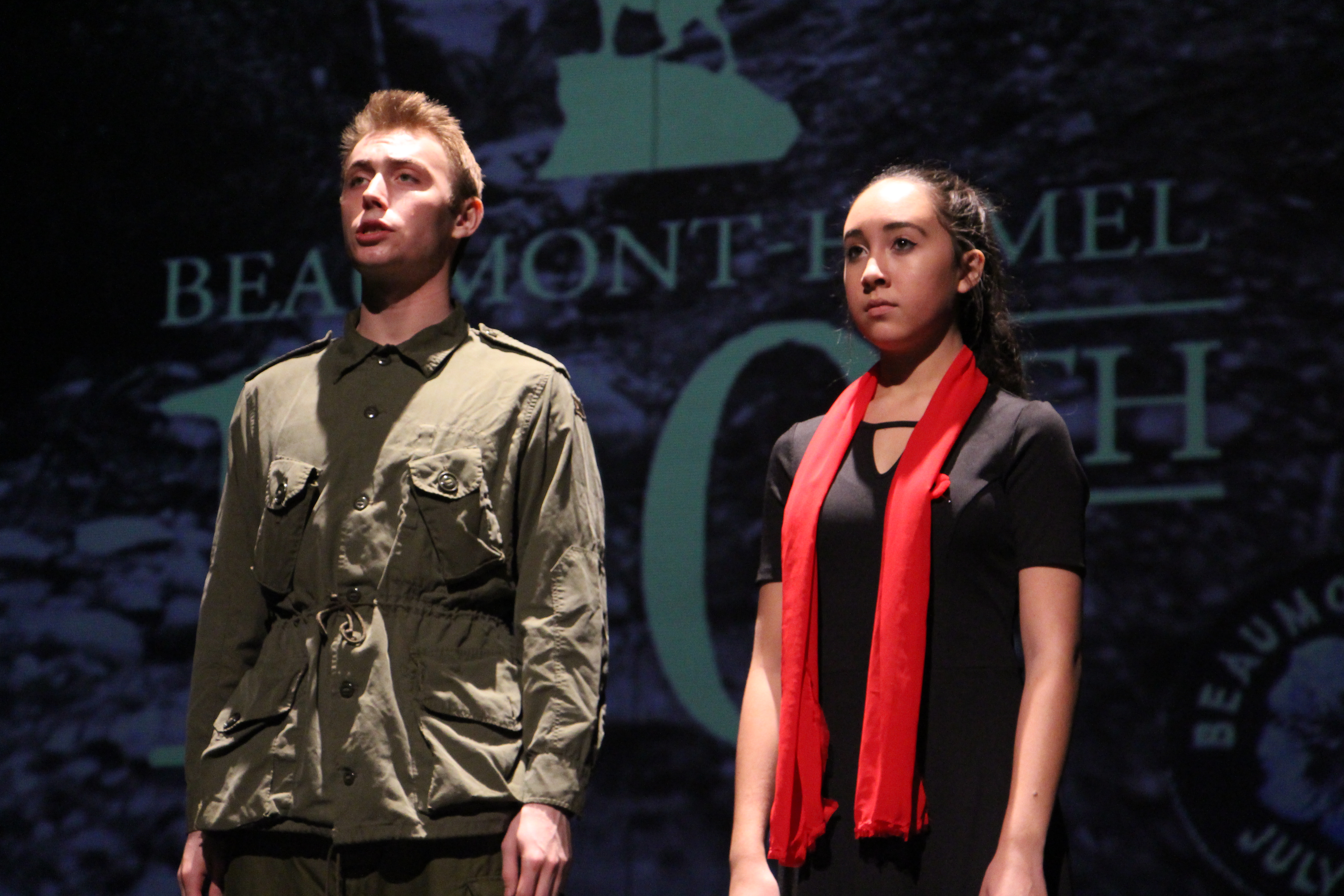 Students stood in front of images of the battles like Beaumont-Hamel in northern France, fought exactly 100 years ago this year, to highlight the sacrifices of Canadians in war. At Beaumont-Hamel, members of the Newfoundland Regiment were hit especially hard, with only 68 of the more than 800 men surviving the night.