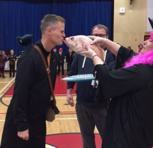 The goal for “Socktober” was to gather 600 pairs of socks. The reward was to help homeless neighbours in New West stay warm by donating socks to the Lookout Society. The fun was to take up Principal Jamie Sadler’s challenge: If F.W. Howay kids could surpass the 600-pair-of-socks goal, Mr. Sadler would KISS A FISH.
