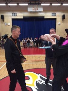 With nearly 826 pairs collected, Mr. Sadler’s fate was sealed. On Tuesday, October 31, in front of a jam-packed gymnasium, the deed was done. And here’s the proof, thanks to school witnesses –